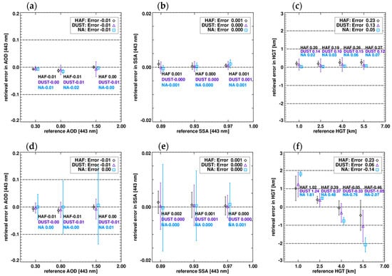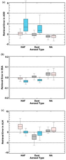 In general, the fitting errors in AOD and SSA are not significant. When the a priori ALH is assumed as the reference condition (Figure 11a), the average errors in AOD are −0.01, −0.01 and −0.01 for HAF, dust and NA aerosols, respectively and a maximum error of −0.02 is found for the NA type. While the average error for NA aerosols is relatively higher than the error for absorbing aerosols, the standard deviation for dust is generally higher than that for the other types. The inversion errors in SSA (Figure 11b) are below 0.001 on average and the deviation in SSA for each aerosol type is almost negligible. Although the magnitude of the error is smaller than that of AOD, it is not negligible due to the narrow range of SSA values, approximately 0.7 to 1.0. In comparison with AOD and SSA, ALH shows a wider range of retrieval errors from 0.19 to 0.27, 0.10 to 0.15 and 0.02 to 0.07 for HAF, dust and NA aerosols, respectively, because the sensitivity of the backscattered radiance to the ALH is relatively lower than the contribution of AOD and SSA.