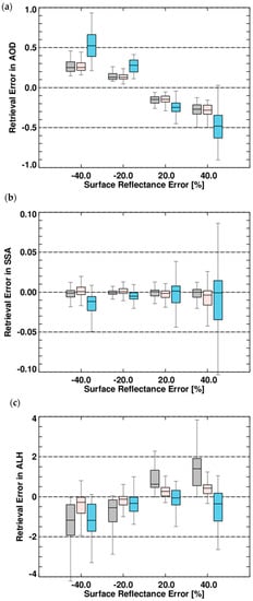 Figure 12 shows the distribution of retrieval errors in retrieval products as a box-and-whisker plot and the median values are summarized for each reference condition in Table 5. While the inversion error in AOD is less than −0.01 for dust (see previous section), the median value of retrieval errors increases to 0.25 when a −40% error is applied (Figure 12a). In general, underestimation of surface reflectance results in an overestimation of aerosol extinction along the optical path and thus leads to an overestimation of AOD. This effect is most significant when the AOD is 0.3 and decreases with increasing AOD (Table 5). The error is most significant for NA aerosols (light blue colored box in Figure 12a), because of different sensitivities of the normalized radiance to changes in AOD for the various aerosol types. In the aerosol model used in this study, the radiance change related to the increase of NA AOD is lower than that of the absorbing AODs. Therefore, a higher AOD is required to offset the underestimation of surface contributions to radiance under NA aerosol conditions.