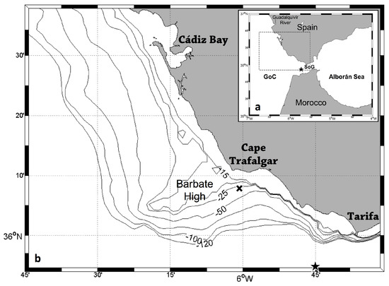 Cape Trafalgar, located along the south-western coast of the Iberian Peninsula, is the imaginary boundary that separates the Gulf of Cádiz (GoC) and the Strait of Gibraltar (SoG; Figure 1). Intricate hydrodynamics characterise these regions, with the SoG being considered one of the most oceanographically complex spots in the world (see e.g., [1,2,3,4]). The surface circulation in the GoC is influenced by one of the branches of the Azores Current that flows eastward producing a front characterised by high mesoscale variability [5,6,7], whereas the circulation through the SoG is induced by a negative hydrological budget in the Mediterranean Sea. As evaporation exceeds the sum of precipitation and river discharge [8], there is a two-layer inverse estuarine circulation that results in an upper Atlantic layer flowing towards the Alborán Sea and an outflow of deep high-density Mediterranean waters towards the Atlantic Ocean [9]. However, this general scheme increases its complexity due to a variety of phenomena such as intense and frequent wind (e.g., [10,11]), transport fluctuations due to the tidal cycles (e.g., [4,12]), or the generation of high-amplitude internal waves associated with periods of spring and neap tides (e.g., [13,14]). Furthermore, the topography strongly modifies this intricate scheme, and is particularly noticeable at the tidal scale (e.g., [15]).