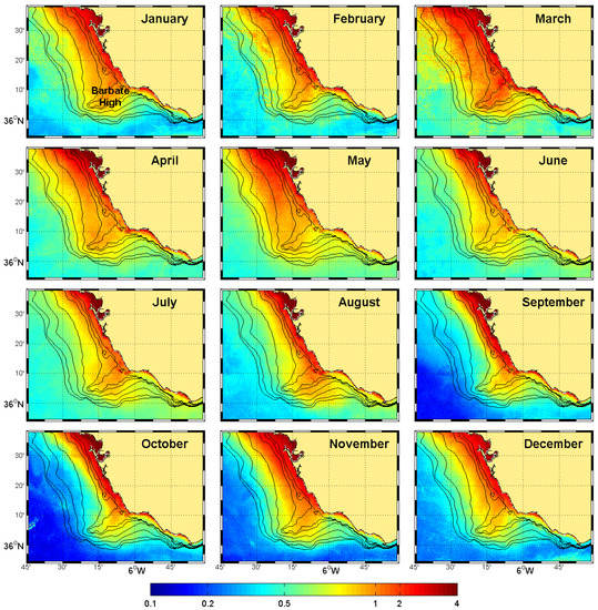 Monthly climatology of MERIS-OC4Me chlorophyll-a concentration (mg m) centred on the Cape Trafalgar region. Black lines represent the bathymetry (15, 20, 25, 50, 75, 100, 120 m).