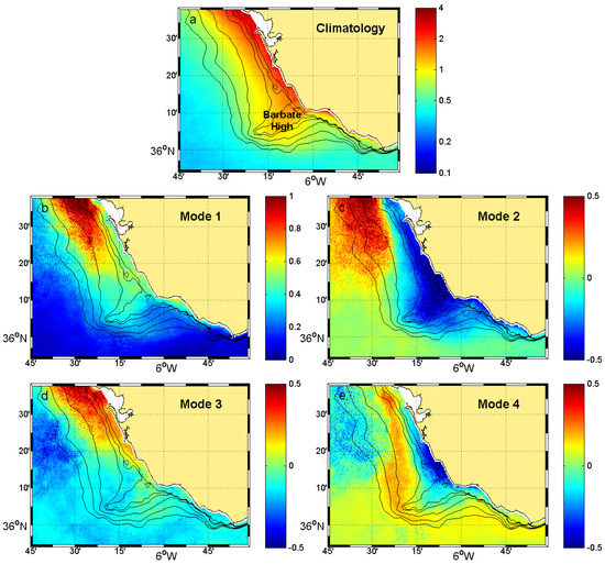 Empirical orthogonal function analysis of fortnightly tidal cycle dataset of MERIS-OC4Me chlorophyll-a concentration (mg m). (a) Fortnightly tidal cycle climatology. Spatial coefficients maps for the (b) first, (c) second, (d) third, and (e) fourth mode. Black lines represent the bathymetry (15, 20, 25, 50, 75, 100 m). Pixels belonging to Cádiz Bay were erased in order to avoid their influence in this analysis.