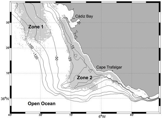 Location of the study zones distinguished by the empirical orthogonal function analyses: Zone 1 (coastal zone in front of Cádiz Bay), Zone 2 (Cape Trafalgar region), and the Open Ocean. Pixels belonging to Cádiz Bay were erased in order to avoid its influence in this analysis.