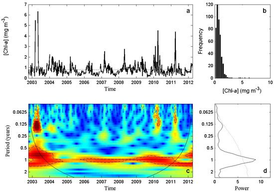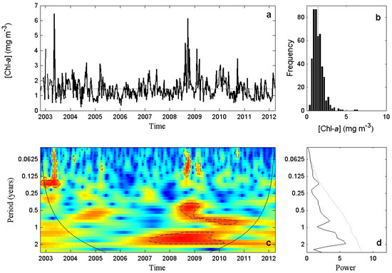 Open Ocean. Figure 6a shows chl-a time series computed for this area. For the whole period, the mean chl-a concentration was 0.76 mg m (dotted line), typical for mesotrophic waters (0.1–1.0 mg m; [45]). However, only in ∼21% of the cases was the chl-a concentration over this value (Figure 6b), with a minimum of 0.15, and a maximum of 2.45 mg m. The WPS of this time series evidenced a strong 1-year periodic component (Figure 6c). This signal was statistically significant in the whole period, and represented on average ∼30% of the total variance (Figure 6d). A second peak, with a low average power spectrum, was found at the temporal cycle between 3 and 6 months (0.125–0.25 year). For this temporal cycle, high power values could be found at the beginning of 2003 and 2004 (Figure 6c), coinciding with high concentration peaks in the area (Figure 6a).