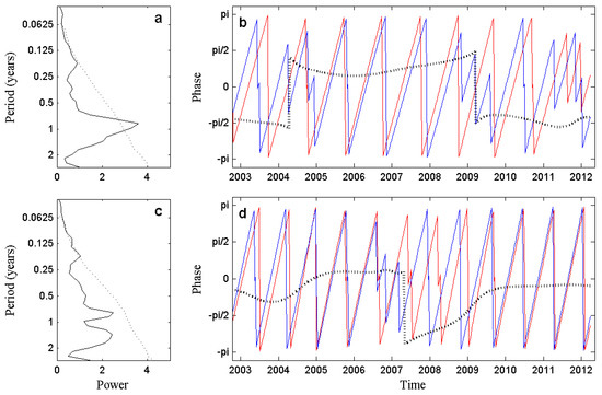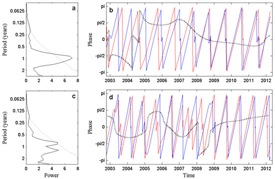 Left-hand panel: Average wavelet cross-spectrum between chlorophyll-a concentration (chl-a; mg m) and Guadalquivir river discharge in Zone 1 (a) and Zone 2 (c). Dotted lines show the = 5% significance levels computed based on 1000 Markov bootstrapped series. Right-hand panel: Phases of the two time series, chl-a concentration (red line), and river discharge (blue line), computed for the peak of highest coherence in Zone 1 (b) and Zone 2 (d). Dashed lines represent the phase difference between both signals.