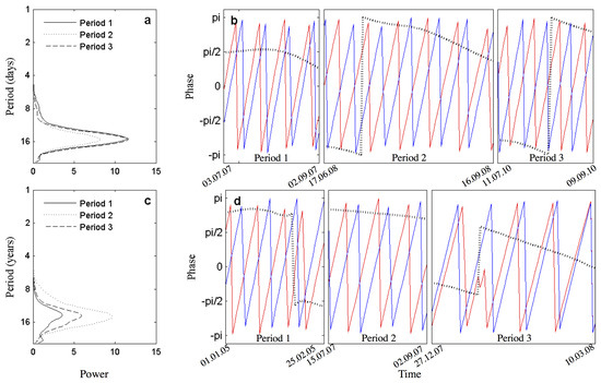 Left-hand panel: Average wavelet cross-spectrum between chlorophyll-a concentration (chl-a; mg m) and zonal component of tidal current (u-tide) for the three selected periods in Zone 1 (a) and Zone 2 (c). Right-hand panel: Phases of the two time series, chl-a concentration (red line), and u-tide (blue line), for the three selected periods, computed for the peak of highest coherence in Zone 1 (b) and Zone 2 (d). Dashed lines represent the phase difference between both signals.