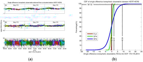 Single difference ionospheric observable retrieved from co-located station HERT-HERS from DOY 173 to 175, 2014, using (A) FL4 (B) SP4 (C) RP4 observable (a) and the cumulative distribution function (CDF) of single difference FL4, SP4 and RP4 observable (after removing the mean value, see Table 5) from the co-located station HERT-HERS (b).