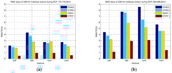Table 8 summarizes the RMS value based on all the four stations for Case 1 and Case 2. As can be seen, the accuracy of the FPPP model is better than 1 TECU when solar activity is low. On the other hand, the RMS of the FPPP model is about 2 TECU when solar activity is high. An interesting finding is that the accuracy of the GAG1 are 2.31 TECUs for Case 1 while the accuracy of the input of the GAG1 model, i.e., the FL4 observable, is below 0.35 TECUs. Therefore, the difference between the accuracy of the GAG1 and FL4 observable may contribute to the model error of GAG1 when using the SH model to represent structure of the ionosphere. Note that these accuracies may be a bit optimistic because the selected four stations are almost all used to generate the four GIM (except station BJFS in model EHRG). However, it is not critical that a particular station is (or not) used by a GIM, as once the GIMs are smoothed the accuracy is maintained up to few hundreds of kilometers from the stations used to derive the ionospheric model [,]. This is confirmed by comparing the results in Table 6 and Table 7 for station BJFS and model EHRG and ESAG.
