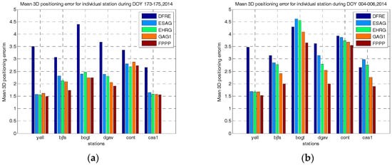 Mean 3D positioning error of individual station for Case 1 (a) and Case 2 (b).