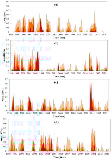 Figure 6 shows that the driest period in terms of drought severity was 2003 for the northeast region and that no severe drought occurred in this region from 1998 to 2010. In all, the area and frequency of extreme droughts in this region were lower than other regions. For the Huang–Huai–Hai region, the drought was severe from 1998 to 2002, but from 2003 to 2013, only a small percentage of this region suffered drought. The MLRY region suffered extreme drought in 2011, and more than 60% of the area experienced extreme drought. At the end of 1998 and 2001, this region also experienced extreme drought. The area and frequency of extreme drought in South China were quite low in 1998 to 2013, and this region experienced extreme drought in 2003, 2005, and 2011. The Sichuan basin suffered extreme drought in 2001, 2006, and 2011, and the characteristics of droughts in this region were that the percentage of severe drought accounted for a larger proportion than droughts of other intensities. The Southwest region suffered quite a wet period before 2009, but this region suffered severe drought after 2009. In all, the North of China (the Huang–Huai–Hai and the Northeast regions) experienced severe drought from 1998 to 2003, whereas the MLRY, the South, the Southern, and the Sichuan regions experienced severe drought around 2011.