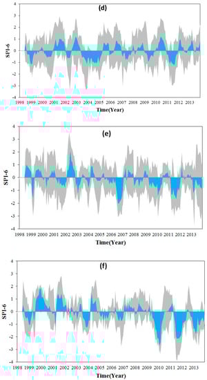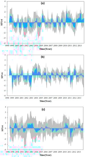 SPIs calculated at a time scale of 6 months by gauge data were selected, and are depicted as the gray filled areas shown in Figure 8. The mean SPIs for each region calculated by Equation (1) are presented as the blue filled areas. As can be seen in Figure 6, Figure 7 and Figure 8, the changes in drought presented in Figure 8 from year of 1998 to 2013 were similar to the changes monitored by TRMM data shown in Figure 6. Most of the drought events detected by station gauge data were also detected by TRMM data; this means the TRMM data provide not only the spatial coverage of the drought, but also accurate drought intensities at specific time scale compared to station gauge data.