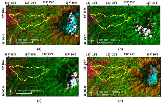 Original Landsat OLI sub-images dated 26 May 2013 (a); 14 August 2013 (b); 4 August 2015 (c); and 18 May 2016 (d). Yellow polygons denote the Daihachiga river basin. OLI bands 6, 5, and 4 are shown in red, green, and blue, respectively.