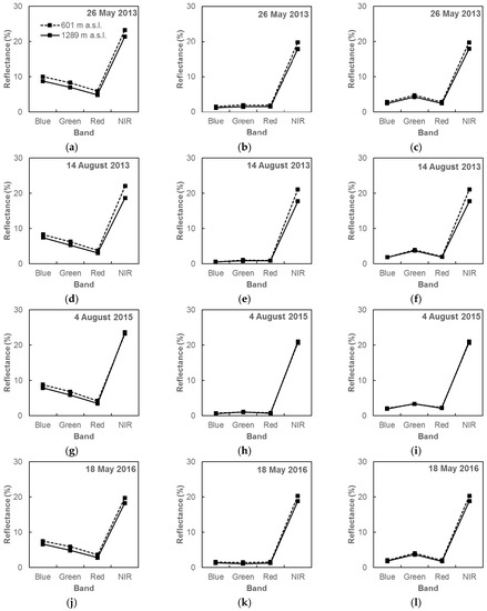 Reflectance of ECF pixels at two different altitudes (601 m a.s.l. and 1289 m a.s.l.) before atmospheric correction (a,d,g,j), after elevation-dependent DOS (b,e,h,k), and after the application of additional offset (c,f,i,l) for Landsat OLI sub-images dated 26 May 2013, 14 August 2013, 4 August 2015, and 18 May 2016, respectively.