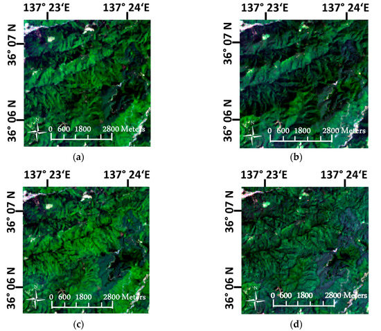 The satellite imagery of the study area was strongly affected by vertically non-homogeneous atmospheric scattering and, therefore, required careful atmospheric correction. Strong atmospheric conditions were induced by high humidity (climate of central Japan is characterized by humid spring and summer), the seasonal variation of scattering effects (the monsoonal circulation leads to prevailing Mie and Rayleigh scattering in the first and second half of the year, respectively), and a large altitudinal gradient in the mountainous terrain (the optical depth decreases with elevation) [30,40]. To atmospherically correct the OLI imagery, we implemented an empirical algorithm, elevation-dependent DOS [30]. This method stems from classical DOS [41] based on the assumption that at least a few pixels within a satellite image (like deep clear water) have zero reflectance (and DN). As these pixels supposedly represent atmospheric scattering, they will not appear absolutely dark. The resulting nonzero value of the pixel should be subtracted from DNs. The DOS method has a great advantage because it is established solely on the imagery with no requirement of ground measurements. Unlike the classical algorithm, the elevation-dependent DOS assumes the presence of the dark object in each selected altitudinal range. Therefore, it can correct for elevation (altitude)-dependent differences in atmospheric effects, which to the best of our knowledge, neither classical DOS nor available commercial software for atmospheric correction would correct.