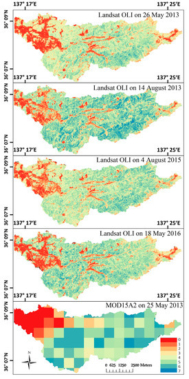 LAI estimations based on Landsat OLI sub-images dated 26 May 2013, 14 August 2013, 4 August 2015, and 18 May 2016, and the LAI map from the MOD15A2 dated 25 May 2013 over the Daihachiga river basin. The red color (LAI = 0) outlines the urban areas, grasslands, water objects, rice paddies, crops, and bare lands.