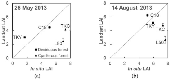Figure 7 shows the results of the in situ validation of the estimations on 26 May 2013 and 14 August 2013. The validation procedure verified an adequate performance of the simple LAI model at DBF plots, but the model underestimated the LAI in ECF and DCF areas. The model-based LAI was seasonally and interannually stable within the range 2.7–3.3 at L50 and 4.3–5.4 at TKC during the study period. The largest underestimation occurred in the DCF areas.