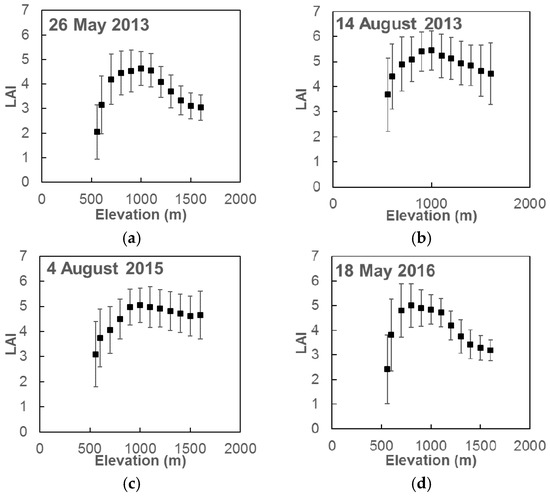 Spatial average LAI of DBF area for each 100-m altitudinal zone based on Landsat OLI sub-images dated 26 May 2013 (a); 14 August 2013 (b); 4 August 2015 (c); and 18 May 2016 (d) over the Daihachiga river basin. Error bars represent standard deviations.