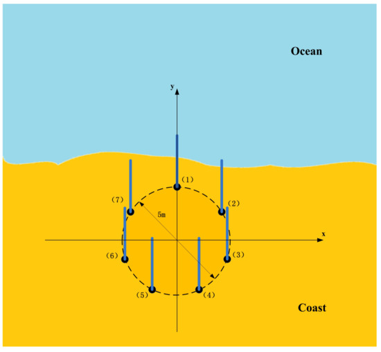 The receiving array consists of seven uniformly spaced dipole antenna elements positioned on a circle with a diameter of 5 m, as shown in Figure 1. Each wide band antenna is designed for receiving signals from 7.5 MHz to 25 MHz with a height of 3 m and a standing-wave ratio (SWR) below 1.8. The transmitting part, which consists of three 7.5-m monopole antennas that occupy an area of m, is capable of radiating omnidirectional electromagnetic energy in the band of 7.5–25 MHz to the sea surface. The transmitting antennas were installed on a ground mat realized by alloy wires. The distance between the transmitting antennas and receiving antennas is approximately 100 m. Table 1 shows more details of the MHF-C system.