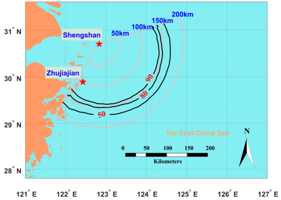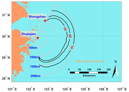 Analyzing the percent coverage map is a possible method of examining the actual spatial coverage of radar current measurements. For the MHF-C radar, the signal to noise ratio (SNR) threshold of the first-order signal, which is related to the spatial coverage and accuracy of current measurements, is set to 8 dB for the current estimation. Figure 2 shows the spatial coverage of radial currents estimated from the 8.27 MHz data that were obtained from the Shengshan radar from 11 March to 15 March 2016. The gray lines indicate the range of the Shengshan radar, and the black contour lines indicate the percent spatial coverage of current measurements. The percent coverage of currents at the range of 150 km is approximately 90%. As shown in Figure 3, from 11 March to 15 March 2016, the Zhujiajian radar operating at 7.88 MHz shows a similar detection distance with a percent coverage of 90% at the range of 150 km, and the 50% contour line reaches 190 km.