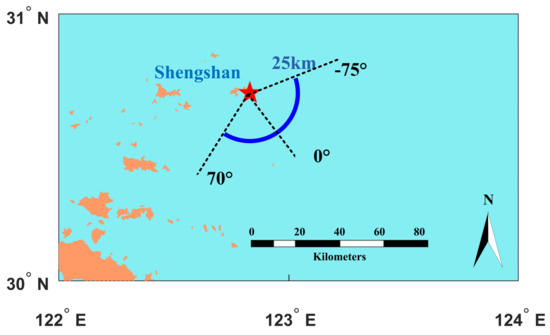 The map in Figure 9 shows that Point A is located on the baseline of the Zhujiajian and Shengshan sites. Assuming that the current speed and direction at Point A are v and , respectively, then the radial currents measured by the Shengshan and Zhujiajian MHF-C radars, denoted as and , respectively, are equal to the following: