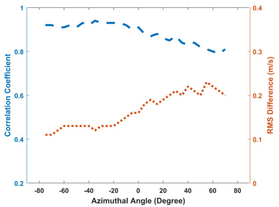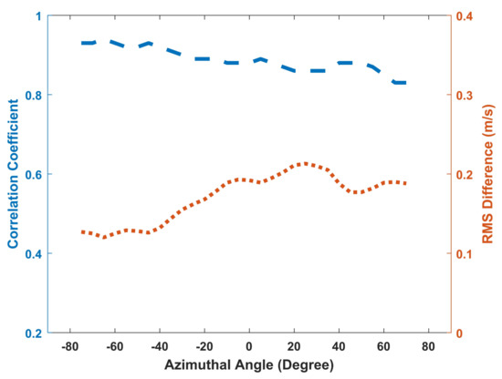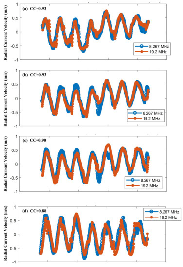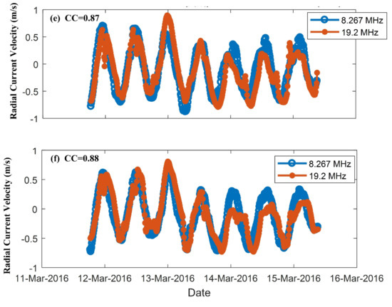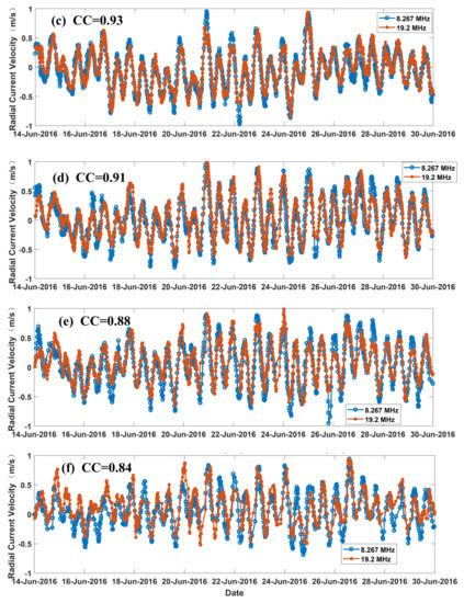 The blue line in Figure 4 shows that thirty sampling cells are in the range of 25 km by varying the azimuthal angle from −75 to 70 with a uniform interval of 5 . For Observation Period I, thirty comparisons are performed between the f1-derived and f2-derived radial current series at these cells, and several typical comparisons are shown in Figure 5. Figure 5a shows the comparison between f1-derived and f2-derived radial current series at the azimuthal angle of −75 . The f1-derived currents match well with the f1-derived time series with a correlation coefficient (CC) of 0.93. The time series at azimuthal cells of −45 , −30 , 0 , 15 and 45 are also shown in Figure 5b–f, respectively, with a CC > 0.87. Figure 6 shows the CCs and root mean square (RMS) differences of the radial current measurements derived from 8.27 MHz and 19.20 MHz at the different azimuthal angles, with CCs varying from 0.83 to 0.93 and RMS differences varying from 0.12 m/s to 0.21 m/s. These results clearly show that the current measurements at 8.27 MHz are consistent with the time series at 19.20 MHz at different azimuth cells. The same type of test was conducted during Observation Period II, and results are shown in Figure 7 and Figure 8. These results illustrate that the Shengshan MHF-C radar maintains the same sampling performance when it steers from −75 to 70 , and in theory, this circular array is capable of maintaining the same angle resolution from 0 to 360 if shelter areas, e.g., buildings or hills, are not observed in the direction of radio radiation.