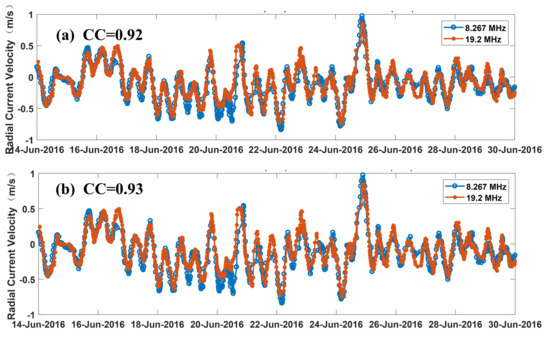 Because the MHF-C radar is capable of radiating an ocean patch with diverse operating frequencies in every Doppler period, the constant current velocity in the patch can be extracted from different Doppler spectra obtained from the echoes at corresponding operating frequencies. During Observation Period I and II, the signals at 8.27 MHz (f1) were able to sense sea surface currents up to 200 km offshore with a range resolution of 5 km, and echoes operating at 19.20 MHz (f2) were used to provide near shore radial current maps with a range resolution of 1 km. Both operating frequencies (f1 and f2) are able to provide radial current measurements at the range of 25 km every ten minutes. Comparisons between f1-derived and f2-derived radial current series at the same sampling cell provide a direct approach to evaluate the consistency of current measurements.