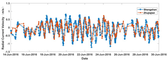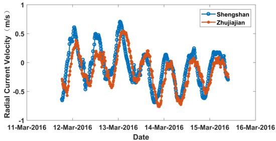 Figure 10 displays the comparison of the radial current series derived from the Shengshan and Zhujiajian radars at Point B, which is located close to Point A during Observation Period I. Moreover, the Zhujiajian radial current values have an added minus sign. The radial current measurements at Point B are utilized for this comparison instead of Point A because Point A is outside of radar coverage. The CC and RMS difference of this comparison are 0.81 and 0.2 m/s, respectively. Figure 11 shows the same type of comparison at Point B during Observation Period II, with a CC of 0.77 and a RMS difference of 0.23 m/s. A good performance of both the Shengshan and Zhujiajian MHF-C radars is likely required to generate the consistency between the series in Figure 10 and Figure 11.