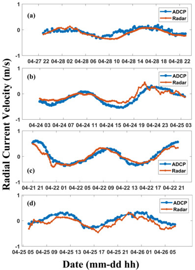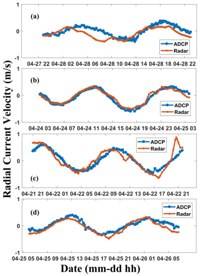 Radial current comparisons using the Zhujiajian MHF-C radar at: (a) Point C; (b) Point D; (c) Point E; and (d) Point F.