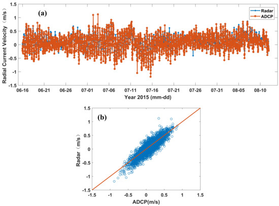 Radial current comparisons using the Shengshan MHF-C radar at Point G during Observation Period III: (a) time series; and (b) scatter diagram.