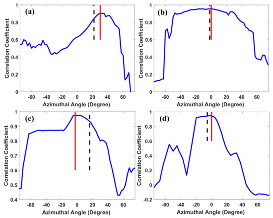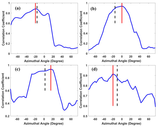 The CC profiles of the Zhujiajian MHF-C radar radial current measurements at: (a) Point C with a bearing offset of 2.5; (b) Point D with a bearing offset of 15; (c) Point E with a bearing offset of 12.5; and (d) Point F with a bearing offset of 10. Red solid line indicates the angle with the maximum CC, and the black dashed line indicates the expected angle.