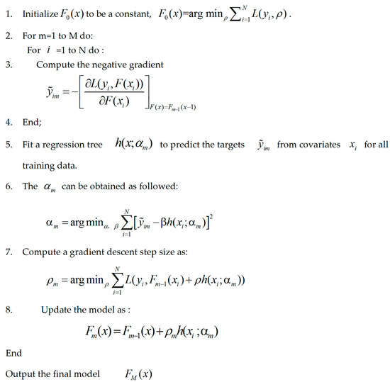 The GBRT produces competitive, highly robust, and interpretable procedures for both regression and classification. This was a method first proposed by Friedeman [51]. The core idea of this model is to generate a strong classifier by constructing an M amount of different weak classifiers through multiple iterations in order to reach the final combination. Each iteration is designed to improve the previous result by reducing the residuals of the previous model and establishing a new combination model in the gradient direction of the residual reduction. To describe the accuracy of the model, a loss function defined as L(y, F) is introduced. The frequently employed loss functions include squared-error and absolute error [51]. Suppose that