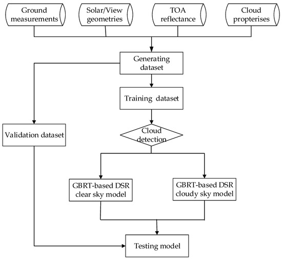 Machine learning methods, which learn the relationship between inputs and outputs by fitting a flexible model directly from the data, are some of the most widely used methods to estimate DSR [40,41,42,43,44,45]. Wang [43] proposed a method try to derive DSR measurements using Moderate Resolution Imaging Spectroradiometer (MODIS) data (e.g., atmospheric profile product and surface reflectance) based on an artificial neural network (ANN) model. The validation results against ground measurements showed that the maximum root mean square error (RMSE) was less than 45 W·m−2. Qin et al. [44] used an ANN-based method to establish the relationship between the measured monthly mean of daily global solar radiation levels and available remote sensing products with the aim of estimating global solar radiation. Zhou et al. [45] suggested that the Random Forest (RF) model was another feasible way to estimate DSR using satellite observations. These machine learning methods have their own advantages and disadvantages. For example, the attractiveness of an ANN is nonlinearity and high parallelism [46], and the RF cannot extrapolate beyond the training data and may not interpret well for conditions with few samples [47]. Although machine learning may provide powerful methods for estimating DSR from remote sensing data due to their ability to perform adaptive and nonlinear data fitting [48,49,50], the accuracy of the results is limited and many machine learning methods are prone to the phenomenon of overfitting. This can be avoid by using the gradient boosting regression tree (GBRT) method [51]. In addition, the GBRT can efficiently provide high accuracy. However, it has not been widely used for estimating DSR.
