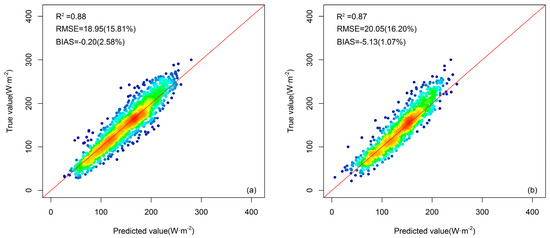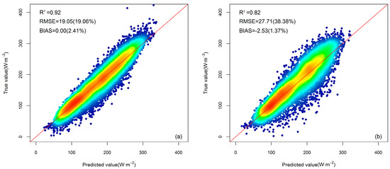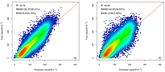 Figure 6 presents the evaluation results of the GBRT-based DSR cloudy sky model using the training dataset and the validation dataset. The daily DSR estimates for the training dataset under the cloudy sky conditions have an overall RMSE value of 33.37 W·m−2 (30.21%), an R2 value of 0.79, and a bias value of 0.01 W·m−2 (4.74%). These values for the validation dataset were 42.97 W·m−2 (34.57%), 0.64, and −2.83 W·m−2 (1.45%), respectively. The accuracy was slightly lower than that of the clear sky model, which may be related to the influence of clouds [76].