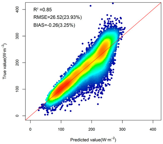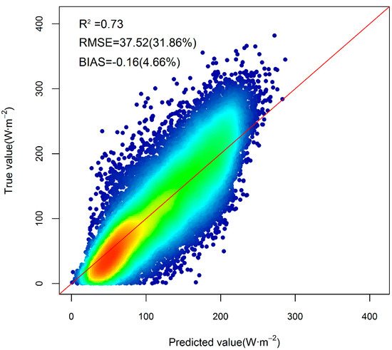 Validation results of the estimated daily DSR based on the GBRT model without considering AVHRR channels 4 and 5 as the input variables under cloudy sky conditions. The number in the parentheses is the percent bias or RMSE value.