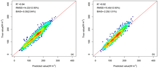 Similar to what we did with the GBRT model, we also validated the estimated DSR at a monthly time scale to further show the accuracy of the ANN method. To perform the comparison, monthly DSR estimates were calculated by averaging the daily DSR of each month. Figure 12a shows the evaluation results of the training dataset based on the ANN-based DSR model in 2003 at a monthly time scale. The R2 was 0.88, which was lower than that of GBRT model. The RMSE was 18.95 W·m−2 (15.81%) larger than that of GBRT model. The evaluation results of the validation dataset’s monthly estimated DSR based on the ANN-based DSR model is shown in Figure 12b. The R2 was 0.87, and the RMSE was 20.05 W·m−2 (16.20%). As in the evaluation results at a daily time scale, it is obvious that the GBRT model performs better than the ANN model at a monthly time scale.
