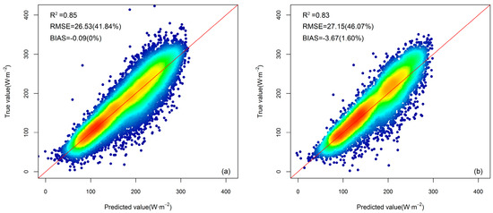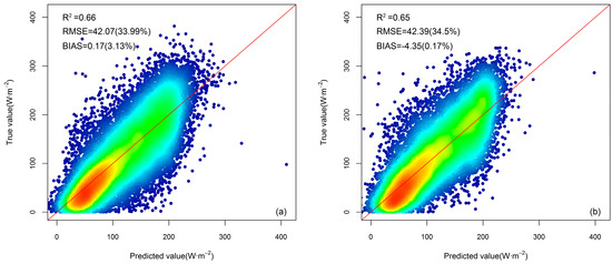(a) Evaluation results of the training set’s estimated monthly mean DSR based on the GBRT-based DSR model against ground measurements in 2001 and 2002. (b) Evaluation results of the validation set’s estimated monthly mean DSR based on the GBRT-based DSR model against ground measurements in 2003. The number in the parentheses is the percent bias or RMSE value.