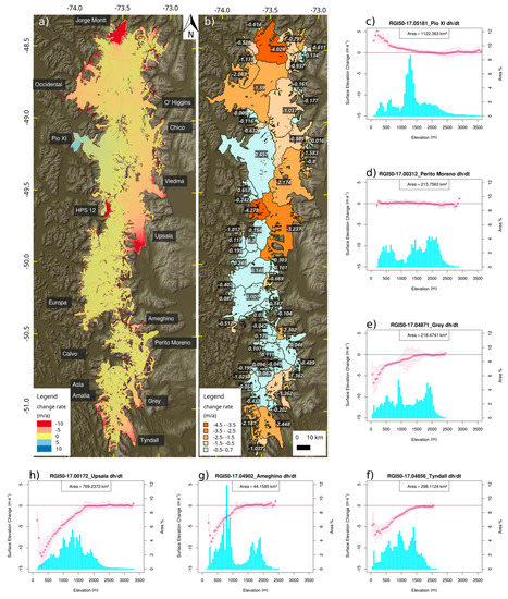 Elevation change maps of the SPI; names denote the major outlet glaciers. (a) pixel-based assessment 2000–2015/16; (b) averaged on catchment basis; (c–h) hypsometry (cyan) and elevation changes (red) plotted for 50 m elevation bins for different glaciers. Pio XI glacier is known for its anomalous development at its two termini. As a singular exceptional case over the whole icefield it is attributed a neutral to slightly positive surface change rate on the plateau-like higher altitudes but experiencing lifted surface at the tongue, with rates increasing downstream to a maximum of 8 m·a−1 at its southern terminus. All graphs only refer to surveyed area which amounted for a total of 10772 km2 for (a) and (b).
