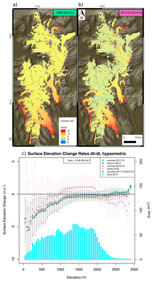 In Figure 3 we compare different time periods for a subset of the southernmost SPI. The maps (a) and (b) reveal that the interval 2011/12–2015/16 shows positive dh/dt values in particular at higher elevations, but also on some of the glacier tongues such as at Perito Moreno. On the other hand, glacier tongues having shown negative elevation changes in 2000–2011/12 also exhibit a similar negative pattern in the 2011/12–2015/16 period. For the altitude range between 1000–2000 m the surface increased at maximum rates of 1.11 m·a−1 (2011/12–2015/16). As the area at this level is notably large it causes the overall mean elevation change of the studied southern part of the SPI to turn out positive for this period, with 0.128 ± 1.1 m·a−1. The vertical and lateral co-registration accuracy is comparable for both time intervals. It has to be noted that the image differencing 2011/12–2015/16 is based, for both years, on summer acquisitions.
