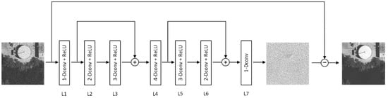 The proposed holistic neural network model (SAR-DRN) for SAR image despeckling contains seven dilated convolution layers and two skip connections, as illustrated in Figure 1. In addition, the proposed model uses a residual learning strategy to predict the speckled image, which adequately utilizes the non-linear expression ability of deep learning. The details of the algorithm are described in the following.