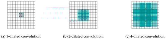 where , , and represents the size of the receptive field. The common convolution receptive field has a linear correlation with the layer depth, in that the receptive field size: . By contrast, the dilated convolution receptive field has an exponential correlation with the layer depth, where the receptive field size: . For instance, when , , while with the same layer depth. Figure 2 illustrates the dilated convolution receptive field size, which: (a) corresponds to the one-dilated convolution, which is equivalent to the common convolution operation at this point; (b) corresponds to the two-dilated convolution; and (c) corresponds to the four-dilated convolution.