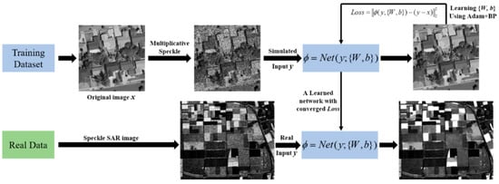 In summary, with the dilated convolution, skip connections and residual learning structure, the flowchart of learning a deep network for the SAR image despeckling process is described in Figure 5. To learn the complicated non-linear relation between the speckled image and original image , the proposed SAR-DRN model is employed with converged loss between the residual image and the output , then preparing for real speckle SAR image processing as illuminated in Figure 5.