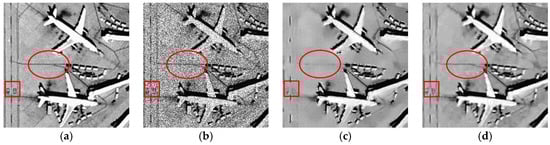 Figure 6, Figure 7 and Figure 8 correspondingly show the filtered images for the Airplane/Building/Highway images contaminated by two-look speckle, four-look speckle, and four-look speckle, respectively. It can be clearly seen that PPB has a good speckle-reduction ability, but PPB simultaneously creates many texture distortions, especially around the edges of the airplane, building, and highway. SAR-BM3D and SAR-POTDF perform better than PPB for the Airplane, Building, and Highway images, especially for strong speckle noise such as L = 1, 2, or 4, which reveals an excellent speckle-reduction ability and local detail preservation ability. Furthermore, they generate fewer texture distortions, as shown in Figure 6, Figure 7 and Figure 8. However, SAR-BM3D and SAR-POTDF also simultaneously result in over-smoothing, to some degree, as they mainly concentrate on some complex geometric features. SAR-CNN also shows a good speckle-reduction ability and local detail preservation ability, but introduces some radiation distortions in homogeneous regions. Compared with the other algorithms above, SAR-DRN achieves the best performance in speckle reduction, concurrently avoiding introducing radiation and geometric distortion. In addition, from the red boxes of the Airplane and Building images in Figure 6, Figure 7 and Figure 8, respectively, it can be clearly seen that SAR-DRN also shows the best local detail preservation ability, while the other methods either miss partial texture details or produce blurry results, to some extent.