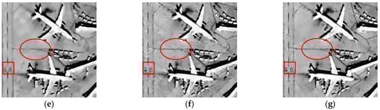 Filtered images for the Airplane image contaminated by two-look speckle. (a) Original image. (b) Speckled image. (c) PPB [13]. (d) SAR-BM3D [14]. (e) SAR-POTDF [16]. (f) SAR-CNN [28]. (g) SAR-DRN.