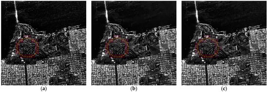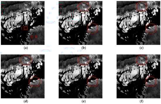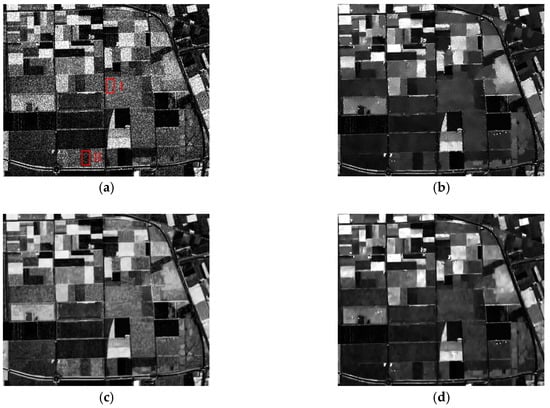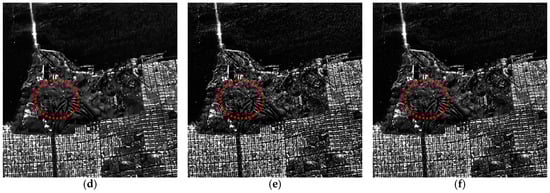 In addition, we also evaluated the filtered results, through ENL in Table 5 and EPD-ROA [15] in Table 6 to measure the speckle-reduction and edge-preserving ability [42], respectively. Because it is difficult to find homogeneous regions in Figure 11, the ENL values were respectively estimated from four chosen homogeneous regions of Figure 9 and Figure 10 (the red boxes in Figure 9a and Figure 10a). Clearly, SAR-DRN has a much better speckle-reduction ability than the other methods, which is consistent with the visual observation.