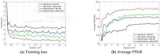 The simulated SAR image despeckling results of the four specific models in (a) training loss and (b) average PSNR, with respect to iterations. The four specific models were different combinations of dilated convolutions (Dconv) and skip connections (SK), and were trained with one-look images in the same environment. The results were evaluated for the Set14 [43] dataset.