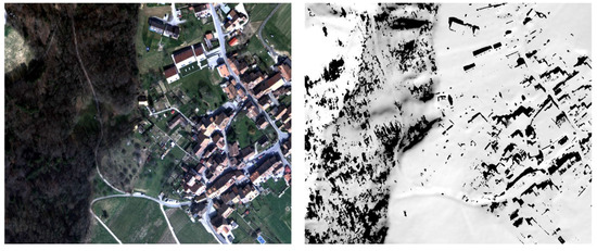 Matched filter and linear mixing procedures use the spectral statistics of the image to derive the shadow fraction [35]. Statistics are taken from non-shaded reflectance references to find large scale shadows. This method is well-suitable for cloud shadow detection [36], but its applicability is not given for high resolution situations such as settlements and tree shadows. The use of region growing approaches to get the correct shadow area borders [37] is a viable addition to these methods. Methods directly using the shadow properties are either based on thresholds to make use of the relative darkness of shadows [38,39], or based on the color properties of shadows [40,41]. Using a blackbody radiation model may further increase the reliability of shadow detection [42].