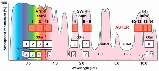 The Advanced Spaceborne Thermal Emission and Reflection Radiometer (ASTER) is a sensor on-board the EOS/Terra platform launched by NASA in 1999. ASTER consists of three separate instrument subsystems, each of which operates in a different spectral region. Bands 1–3, 4–9 and 10–14 cover the VNIR, SWIR and TIR portion of the electromagnetic spectrum respectively (Figure 1; Table 1). The spatial resolution varies depending on the subsystem: VNIR has a resolution of 15 m, SWIR 30 m and TIR 90 m [14,15,16,17,18,19]. It is the first multispectral spaceborne sensor able to discriminate OH-bearing minerals given the larger number of bands within the SWIR region [14].