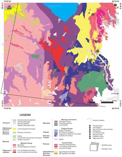 The oldest units of the study area are marine shales, sandstones, conglomerates and carbonate facies from the Siluro-Devonian San Ignacio Formation and the Upper Carboniferous to lower Permian Agua Negra Formation [26,27]. The Tocota Pluton is a Permian granitic to tonalitic intrusive complex that intruded the Agua Negra Formation [21,26,27]. The Choiyoi Group is a Permo-Triassic volcano-sedimentary complex, which is the geologic unit with the largest outcrop surface within the central area of the studied ASTER scene. The Choiyoi Group has been divided into three formations: The Castaño Formation has conglomerates, sandstones and siltstones with volcanic facies (i.e., agglomerates, tuffs and andesite > rhyodacites); The Vega de los Machos Formation is a sequence of andesites, breccias, agglomerates, andesitic tuffs, ignimbrites, latites – dacites; and the El Palque Formation is a volcanic felsic sequence characterized by rhyolitic and rhyodacitic flows, ignimbrites, agglomerates and tuffs [26,28,29]. The geologic map in Figure 3 includes the Atutia Formation, as the youngest units of the Choiyoi Group, based on Heredia et al. 2002 [30]. This unit has been previously mapped as part of the Vega de los Machos Formation (e.g., [26,31]). The Mesozoic Intrusives are a group of plutonic to subvolcanic igneous bodies, which include a Triassic andesite porphyry and the Early Jurassic Las Vizcachas Granodiorite [26,28,30,31]. The Manrique Pluton is a Triassic granitic intrusive body, which we consider here as part of the Mesozoic Intrusives [29]. The Las Vizcachas Formation is a sequence of andesitic flows with minor agglomerates and lithic tuffs. It is Tertiary in age based on stratigraphic relationships (i.e., it is unconformably underlain by the Castaño and Vega de los Machos formations, and unconformably overlain by the Puntas Negras Formation) [26,30,31,32]. All the aforementioned units are located within the central area in Figure 3.
