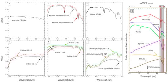 (a–f) Spectral signatures of muscovite, kaolinite, alunite, epidote, calcite, chlorite from the NASA Jet Propulsion Lab Spectral Library [46]. (g) Spectral signature of selected hydrothermal minerals resampled to ASTER bandpasses [48]. Band 5, 6 and 8 highlight kaolinite – alunite-rich argillic, mica-rich phyllic and epidote – calcite – chlorite-rich propylitic alteration zones (respectively).