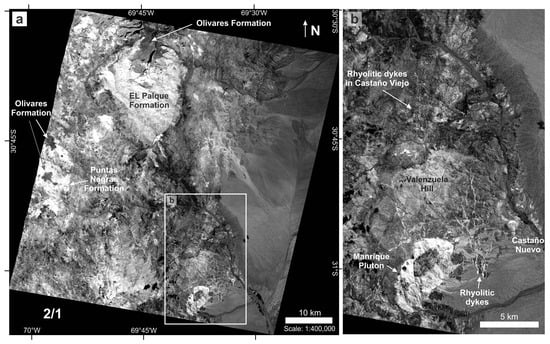 The ASTER band ratio 2/1 detects pixels with intense Fe3+ absorption [58]. (a) In the study area, it discriminates lithology types as it highlights felsic units in bright tones and mafic to intermediate rocks in dark shades. (b) The Castaño area: The Manrique Pluton and particularly the rhyolitic dykes are well-defined.