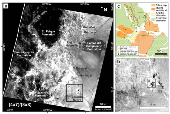 (a) The ASTER bands (4 × 7)/(8 × 8) operation was developed for this study to highlight areas with both phyllic and argillic alteration (bright pixels). This band math operation clearly identifies the location of the Puntas Negras, El Palque, Lomas del Campanario and Las Vizcachas formations (dark shades). (b) Enlarged image of the Castaño Nuevo district, which shows hydrothermal alterations rich in OH-bearing and clay mineral (light shades to white) and the more localized silicified zones and the N-trending rhyolite dykes (black to dark grey). The hydrothermal alteration zones mapped by the ASTER bands (4 × 7)/(8 × 8) operation are consistent with the alteration map proposed by Troy Resources Ltd. for the Castaño Nuevo area (c).